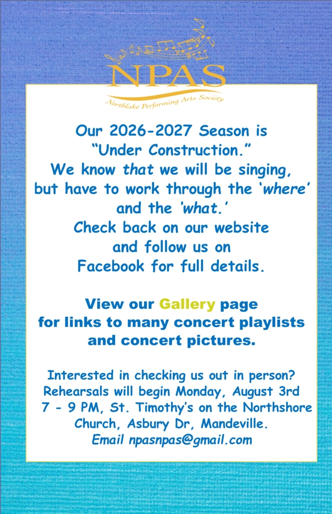 The Northlake Performing Arts Society welcomes new voices to the chorus of excellence. Join us in bringing the sound of inspired music to the Northshore.